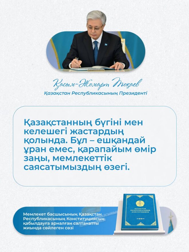 Президент бұл белсенділікті табиғи және қажетті деп атап өтті: жаңа Конституция ең алдымен өсіп келе жатқан буынның мүддесіне жасалады, сондықтан жастар реформаның мазмұны мен нәтижесіне тікелей қызығушылық танытады.