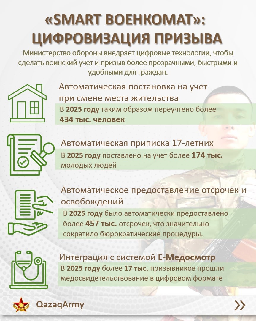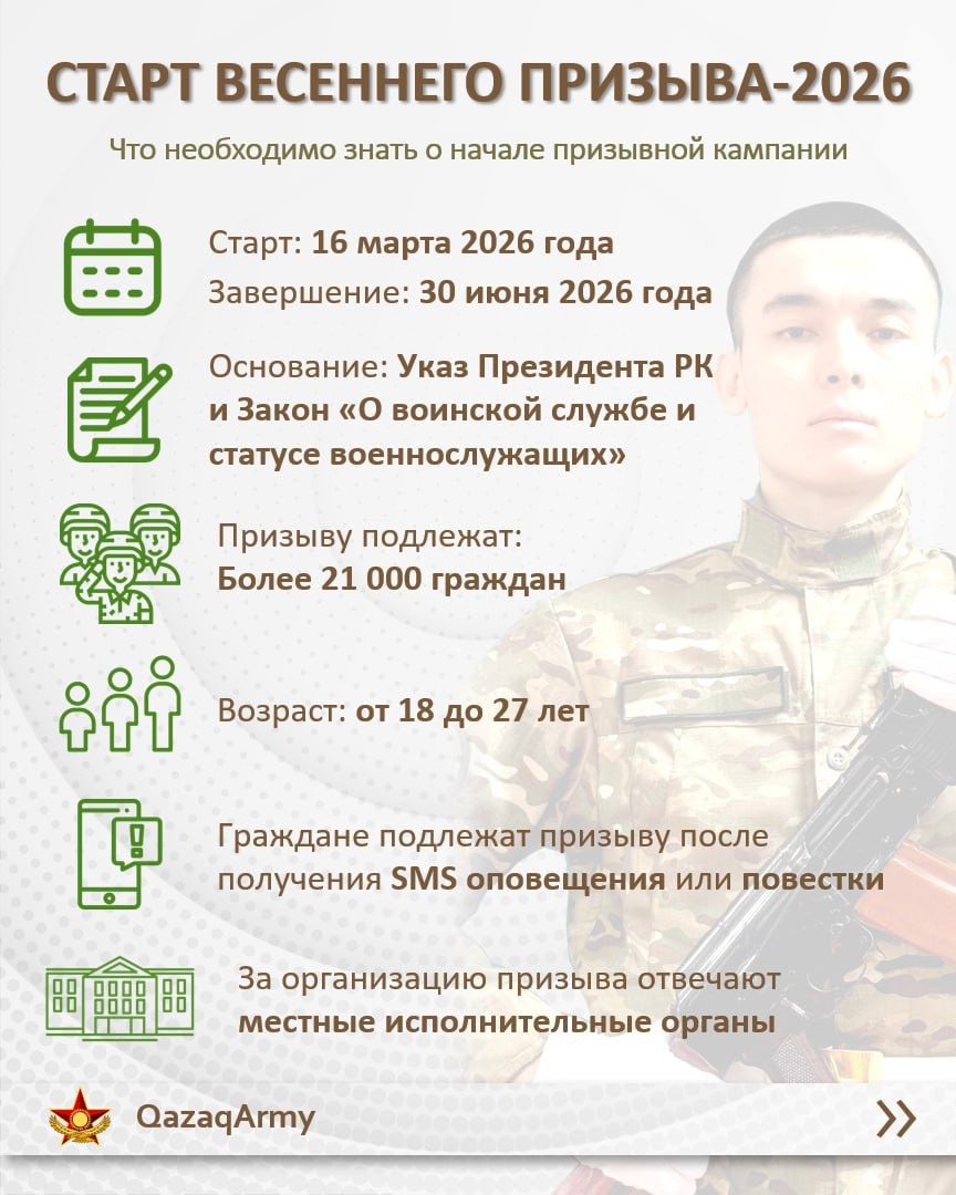 Глава государства подписал Указ «Об увольнении в запас военнослужащих срочной службы, выслуживших установленный срок, и очередном призыве граждан Республики Казахстан на срочную воинскую службу в марте – июне и сентябре – декабре 2026 года».