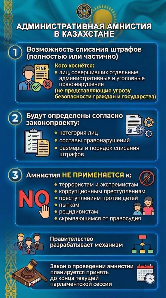 Главой государства Касым-Жомартом Токаевым 17 марта инициировано проведение амнистии в связи с принятием новой Конституции Республики Казахстан. Она коснется лиц, совершивших отдельные уголовные и административные правонарушения, не представляющие угрозу безопасности граждан и государства.
