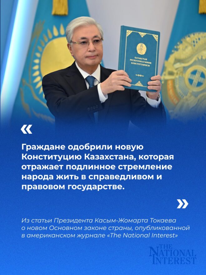 В американском журнале The National Interest вышла статья Президента Касым-Жомарта Токаева о новом Основном законе страны. В статье Президент Казахстана отметил, что недавний конституционный референдум в Казахстане подтверждает приверженность страны курсу на национальное развитие.