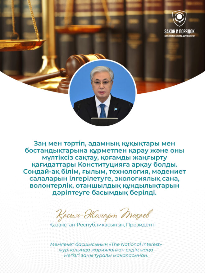— Заң мен тәртіп қоғамдық өмірдің ажырамас бөлігіне айналуы тиіс. Тек осы қағидаттар сақталған жағдайда ғана тұрақты даму мен мемлекеттілікті нығайтуға болады, — деп атап өтті Қасым-Жомарт Тоқаев.