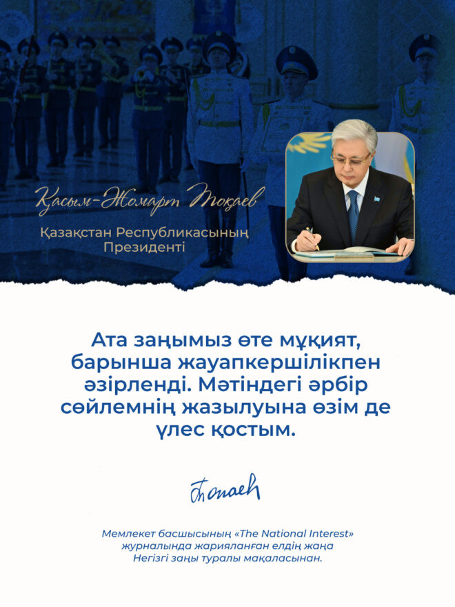Президенттің айтуынша, Ата заң үлкен жауапкершілікпен дайындалып, әрбір нормасы жан-жақты сарапталып, қоғамдық талқылаудан өтті. Бұл – елімізде әділетті қоғам құруға, заң үстемдігін нығайтуға және азаматтардың құқықтарын қорғауды күшейтуге бағытталған маңызды шешім. Шын мәнінде, Конституция – мемлекеттің ғана емес, бүкіл қоғамның болашағын айқындайтын негізгі құжат. Сондықтан бұл реформаларды ел дамуының жаңа кезеңінің бастауы деп айтуға толық негіз бар.