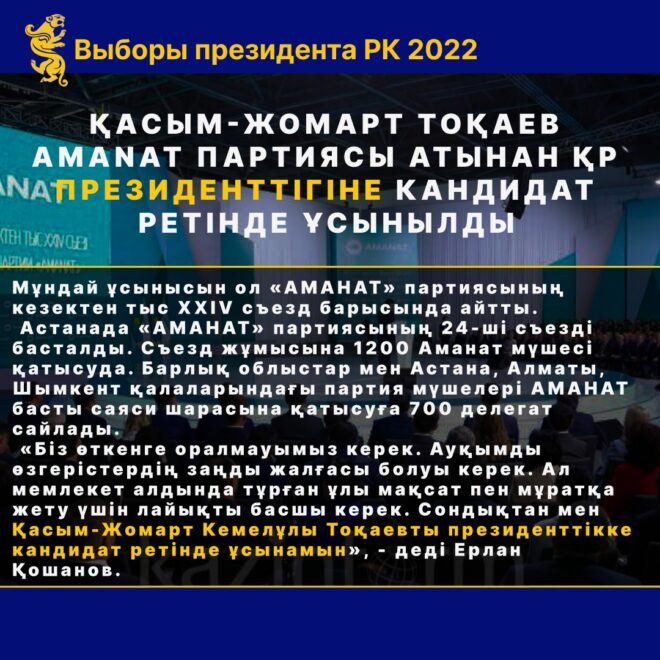 ← Президент сайлауы: Мәслихат депутаттарының бірлестігі Қасым-Жомарт Тоқаевтың кандидатурасын ұсынды Объединение депутатов маслихатов выдвинуло Касым-Жомарта Токаева кандидатом в Президенты РК →