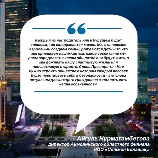 Каждый из нас родитель или в будущем будет таковым, так складывается жизнь. Мы становимся взрослыми создаем семьи, рождаются дети и то что мы прививаем нашим детям, какое воспитание мы даем определяет в каком обществе они будут жить, а мы доживать нашу счастливую жизнь или несчастливую старость. Слова Президента «Нам нужно строить общество в котором каждый человек будет чувствовать себя в безопасности» эти слова актуальны для каждого гражданина в ком есть хоть капля осознанности.