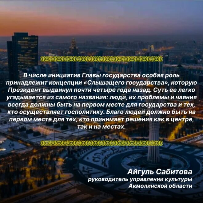 В числе инициатив Главы государства особая роль принадлежит концепции «Слышащего государства», которую Президент выдвинул почти четыре года назад. Суть ее легко угадывается из самого названия: люди, их проблемы и чаяния всегда должны быть на первом месте для государства и тех, кто осуществляет госполитику. Благо людей должно быть на первом месте для тех, кто принимает решения как в центре, так и на местах.