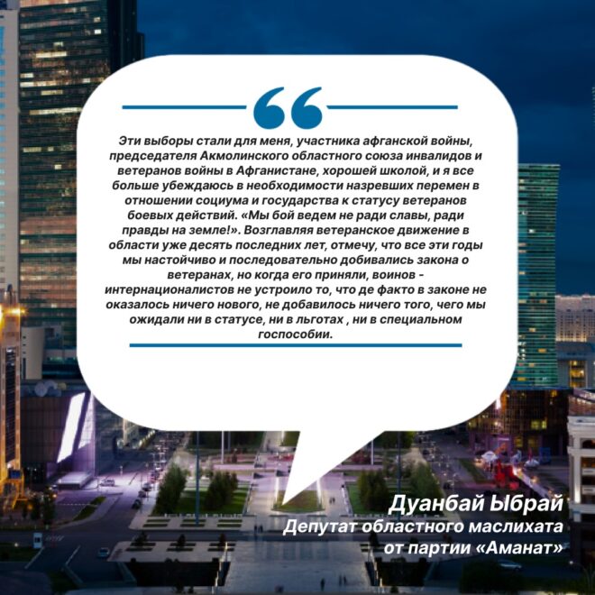 Эти выборы стали для меня, участника афганской войны, председателя Акмолинского областного союза инвалидов и ветеранов войны в Афганистане, хорошей школой, и я все больше убеждаюсь в необходимости назревших перемен в отношении социума и государства к статусу ветеранов боевых действий. «Мы бой ведем не ради славы, ради правды на земле!». Возглавляя ветеранское движение в области уже десять последних лет, отмечу, что все эти годы мы настойчиво и последовательно добивались закона о ветеранах, но когда его приняли, воинов — интернационалистов не устроило то, что де факто в законе не оказалось ничего нового, не добавилось ничего того, чего мы ожидали ни в статусе, ни в льготах , ни в специальном госпособии.