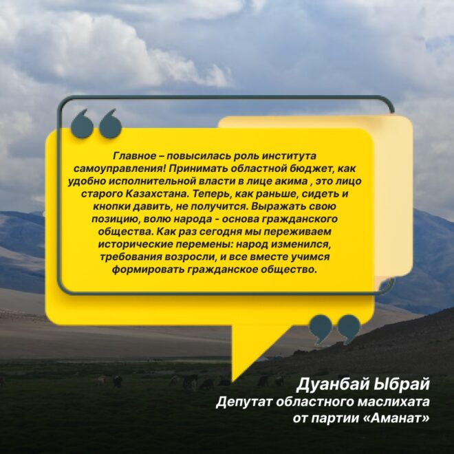 Главное – повысилась роль института самоуправления! Принимать областной бюджет, как удобно исполнительной власти в лице акима , это лицо старого Казахстана. Теперь, как раньше, сидеть и кнопки давить, не получится. Выражать свою позицию, волю народа — основа гражданского общества. Как раз сегодня мы переживаем исторические перемены: народ изменился, требования возросли, и все вместе учимся формировать гражданское общество.