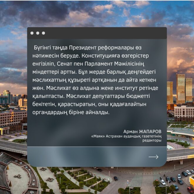 Бүгінгі таңда Президент реформалары өз нәтижесін беруде. Конституцияға өзгерістер енгізіліп, Сенат пен Парламент Мәжілісінің міндеттері артты. Бұл жерде барлық деңгейдегі мәслихаттың құзыреті артқанын да айта кеткен жөн. Мәслихат өз алдына жеке институт ретінде қалыптасты. Мәслихат депутаттары бюджетті бекітетін, қарастыратын, оны қадағалайтын органдардың біріне айналды. Маяк» Астрахан аудандық газететінің редакторы Арман ЖАПАРОВ