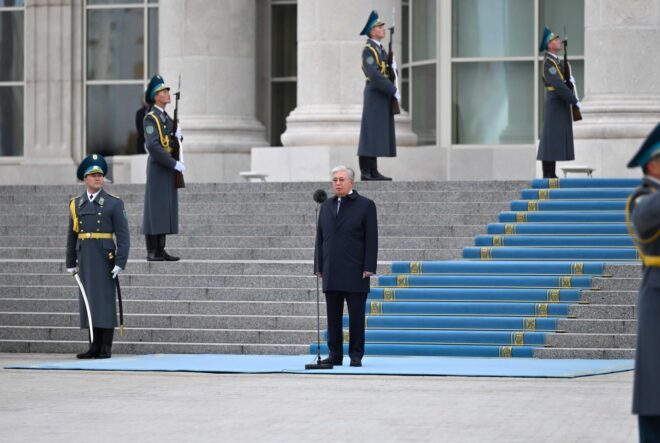 Құрмет қарауылының бастығы Президентке рапорт берді. Бұдан кейін Қасым-Жомарт Тоқаевтың бұйрығымен Мемлекеттік ту көтеріліп, Әнұранымыз шырқалды.