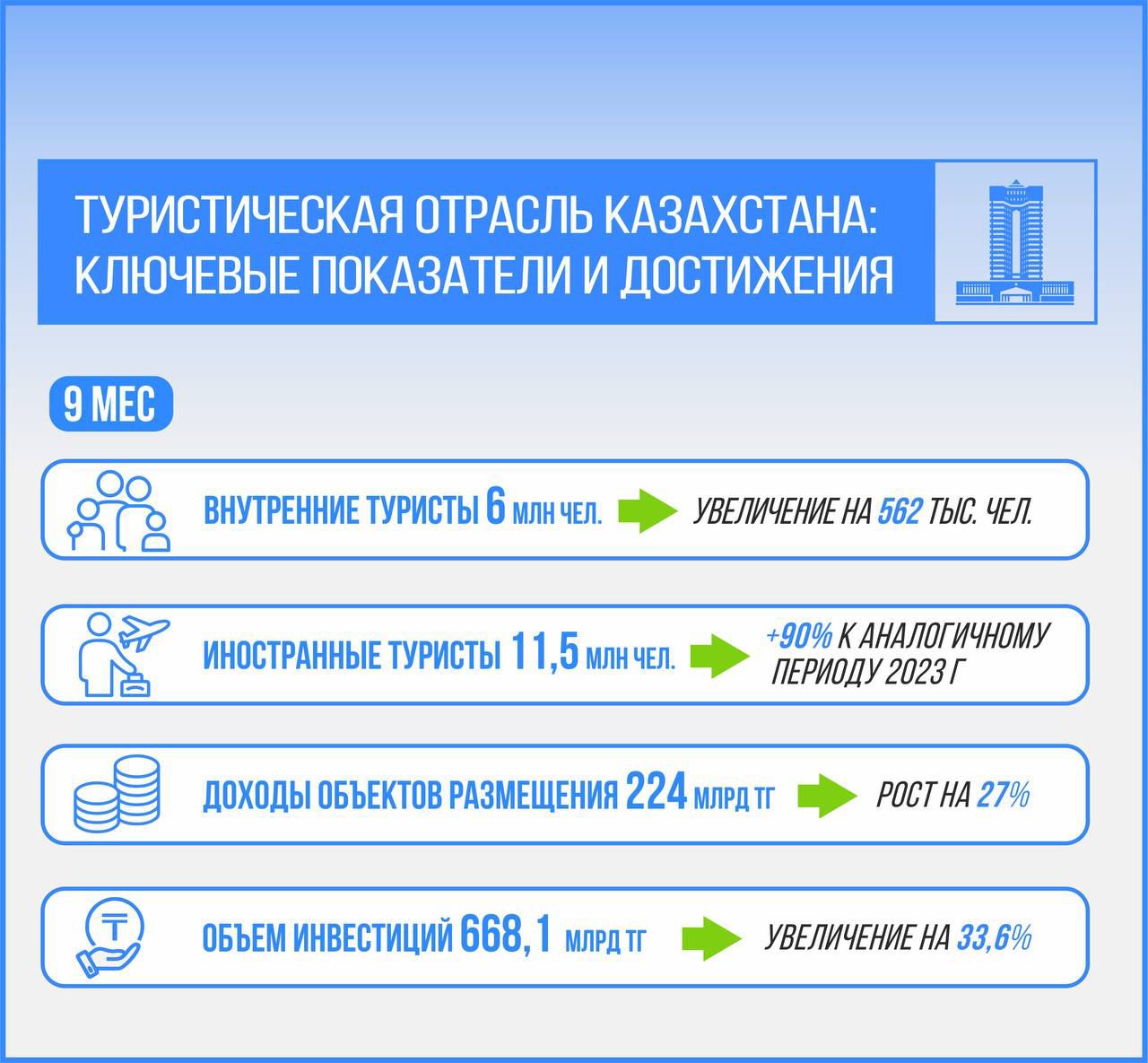 в туристскую отрасль продолжают стремительно расти. За 10 месяцев 2024 года их объем увеличился на 33,6%, составив 668,1 миллиарда тенге.