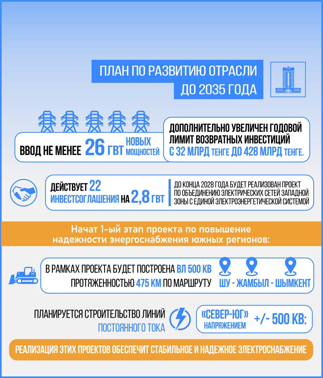 ✔️ За счет проведения реконструкции и расширения действующих электрических станций будет обеспечено ввод дополнительно 5,6 ГВт, из них в 2024 году Министерство заключило 13 инвестиционных соглашений с энергопроизводящими организациями общей мощностью 1,4 ГВт. В числе таких проектов строительство блока №7 на Аксуской ГРЭС мощностью 325 МВт, строительство котлоагрегата и замена турбины на Карагандинской ТЭЦ-3 и расширение парогазовой установки ТОО «Karabatan Utility Solution» с 310 МВт до 620 МВт.