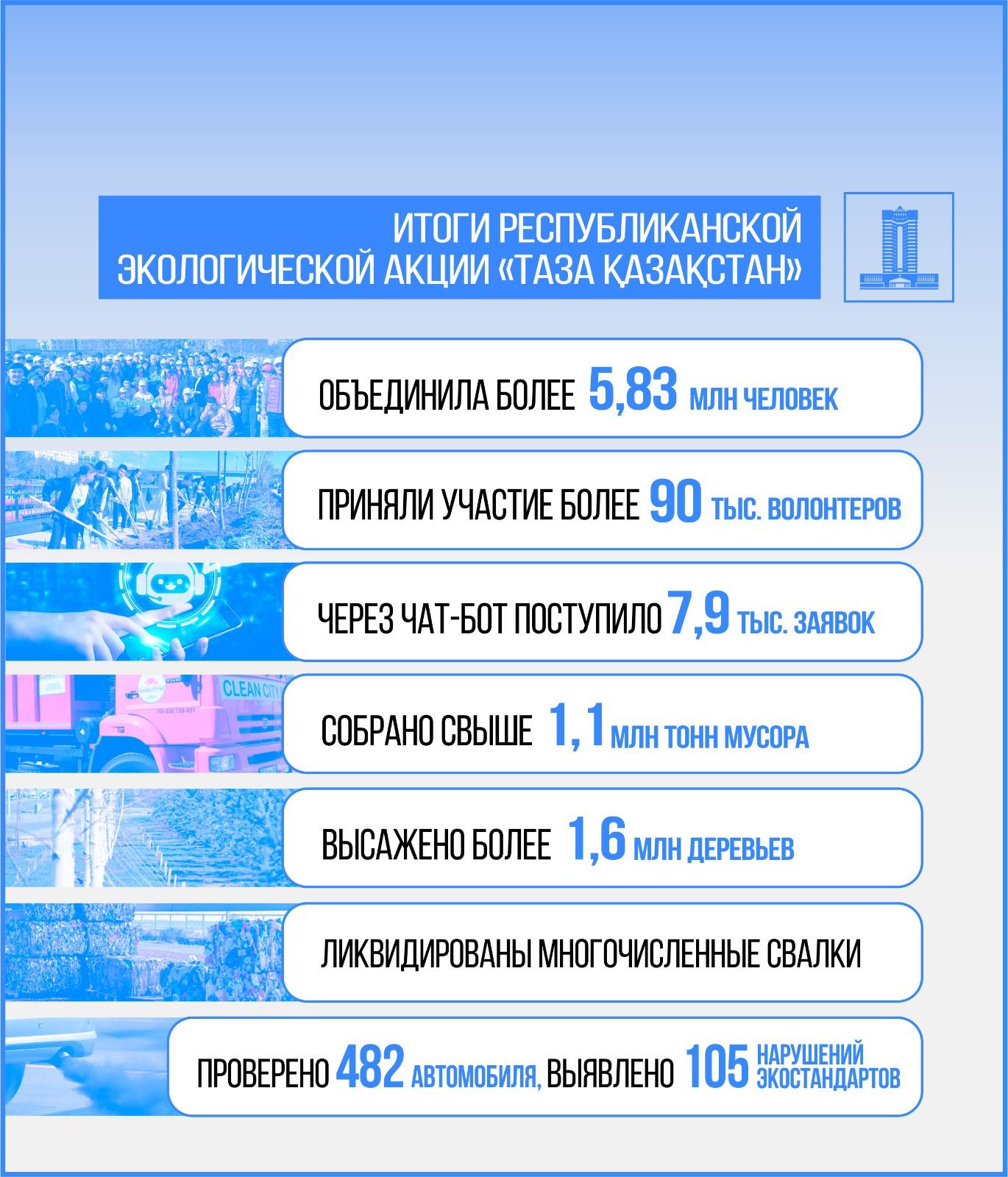 Осы жылдың наурыз-қараша айлары аралығында ұйымдастырылған акция 5,83 млн-нан астам адамның басын біріктірді, бұл – ел халқының едәуір бөлігін құрайды. Іс-шаралар аясында жаппай сенбіліктер өткізілді, олардың барысында 1,1 млн тоннадан астам қоқыс жиналып, 1,6 млн-нан астам ағаш отырғызылды. Мемлекеттік құрылымдар деңгейінде де, еріктілер мен жеке ұйымдарды қоса алғанда, жұртшылық арасында да белсенді түрде жұмыс жүргізілді.