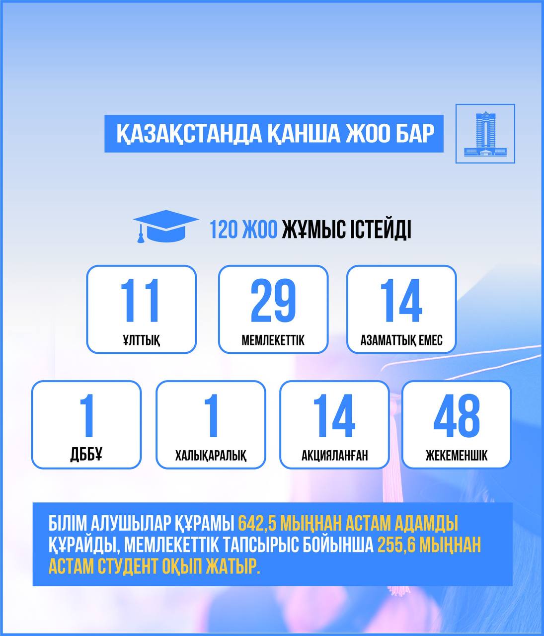 ⚡️ Қазақстанда 120 жоғары оқу орны жұмыс істейді, оның ішінде 11 ұлттық ЖОО бар, мемлекеттік ЖОО – 29, азаматтық емес ЖОО – 14, ДББҰ (дербес білім беру ұйымы) – 1, халықаралық – 1, акционерленген – 16 және жекеменшік – 48.
