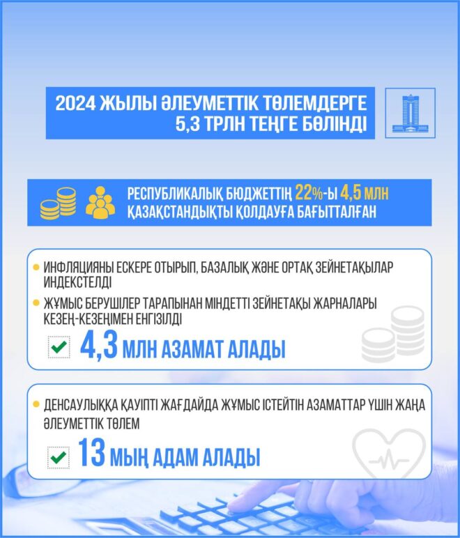 2024 жыл Қазақстанда әлеуметтік қорғау жүйесін дамытудың маңызды кезеңі болды. Негізгі қадамдардың бірі базалық және ортақ зейнетақыларды, сондай-ақ мемлекеттік жәрдемақыларды индекстеумен байланысты әлеуметтік төлемдерді арттыру болды. Инфляцияның болжамды деңгейін ескере отырып, төлем мөлшері ұлғайтылды.