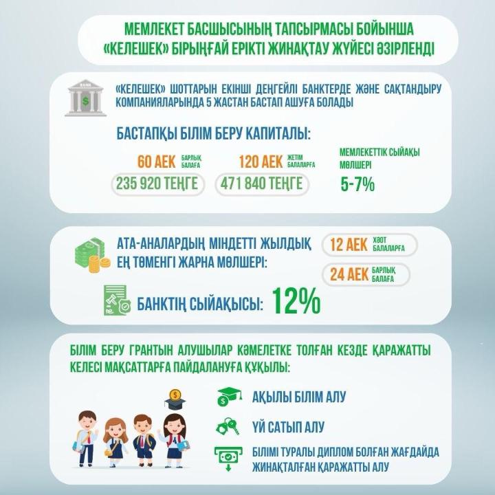 «Келешек» жүйесіне қатысу үшін ата-аналар мемлекеттік білім беру жинақтау жүйесінің қатысушылары болып табылатын екінші деңгейдегі банктерде және сақтандыру компанияларында шот ашуы қажет, онда ағымдағы күнтізбелік жылы 5 жасқа толған балаларға 60 АЕК (2025 жылы 235 920 теңгені құрайды) және жетім балалар үшін 120 АЕК (471 840 теңге) мөлшерінде бастапқы білім беру капиталы, 5-7% мөлшерінде мемлекеттік сыйлықақының жыл сайынғы төлемі және инвестициялық табыс есептелетін болады.
