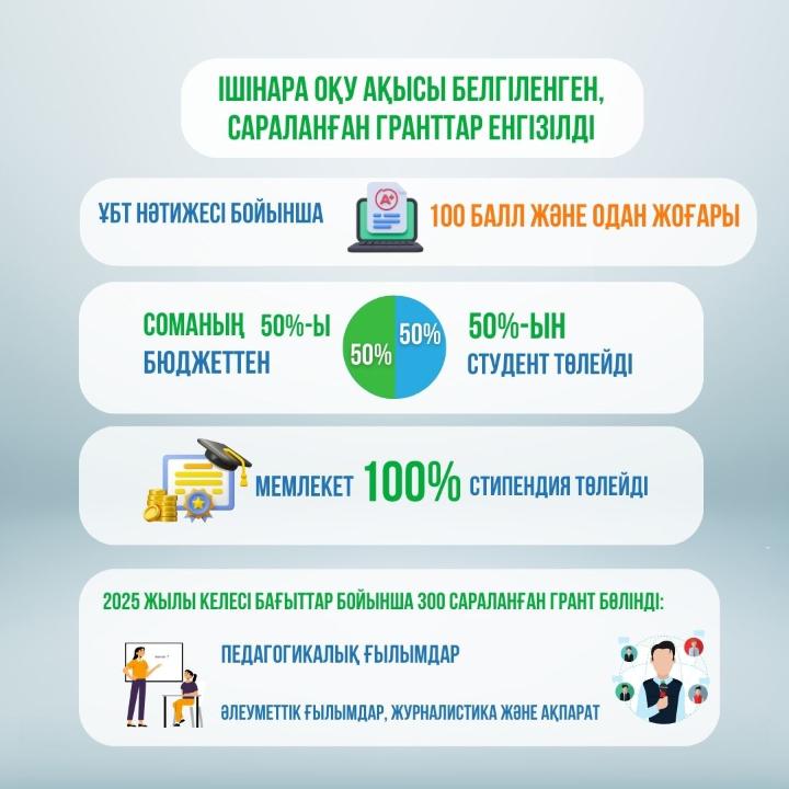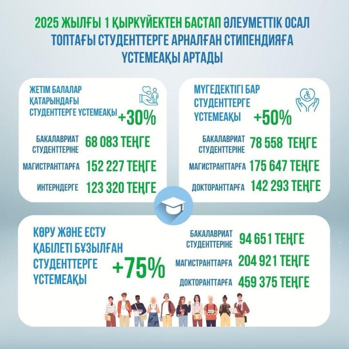 2025 жылғы 1 қыркүйектен бастап бакалавриат студенттеріне стипендия 52 372 теңгеге дейін, ал педагогикалық және медициналық бағыттардағы білім алушыларға – 84 000 теңгеге дейін, магистранттарға – 117 098 теңгеге, докторанттарға – 262 500 теңгеге дейін өседі.