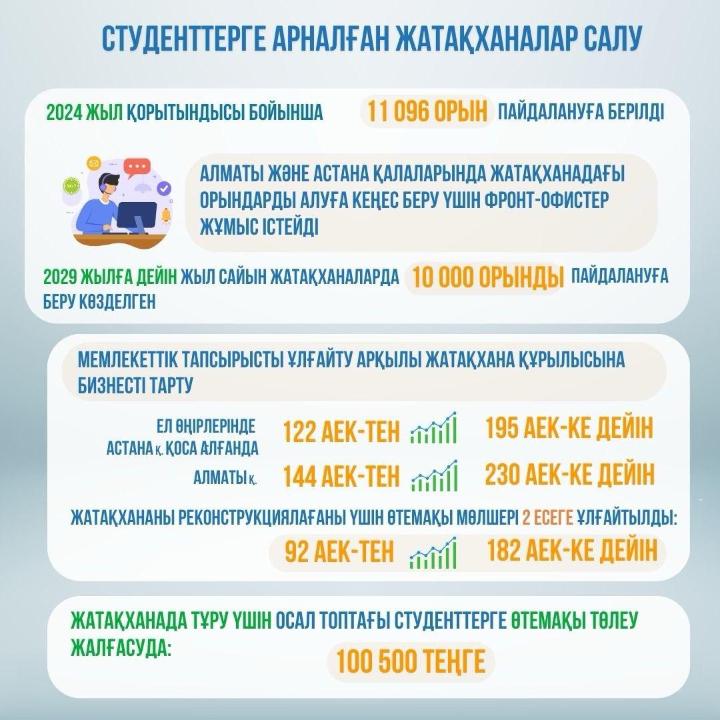 2024 жылы жатақханалар салу бойынша мемлекеттік тапсырыстың мөлшері Алматы қаласында 144 АЕК-тен 230 АЕК-ке дейін, Астана қаласын қоса алғанда, елдің басқа өңірлерінде 122 АЕК-тен 195 АЕК-ке дейін ұлғайтылды.
