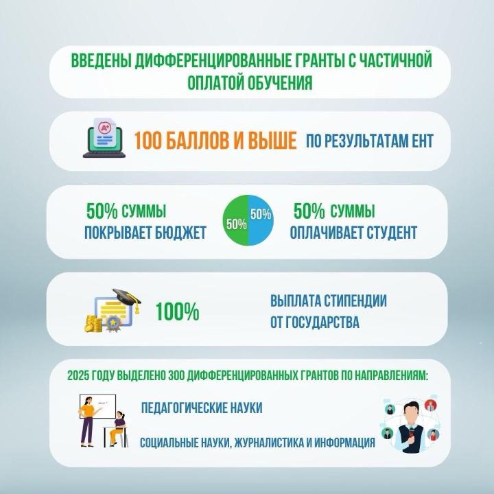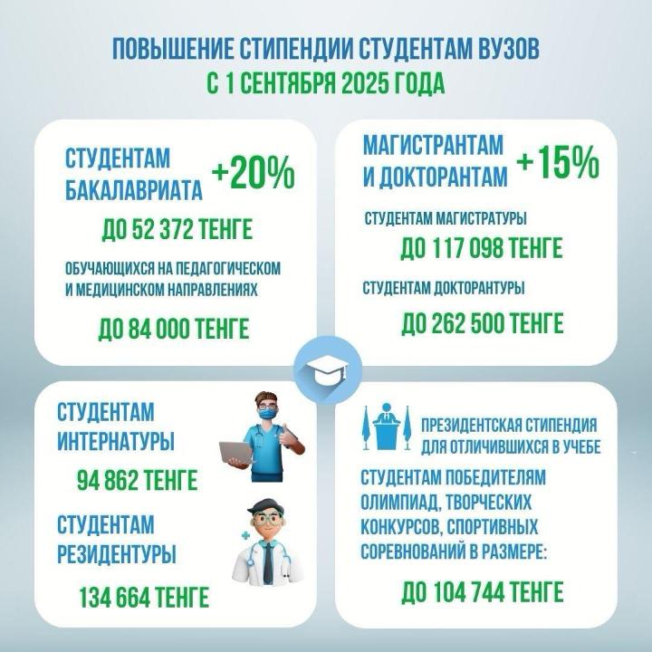 С 1 сентября 2025 года студентам бакалавриата стипендия повысится до 52 372 тенге, а обучающихся на педагогических и медицинских направлениях – до 84 000 тенге, у магистрантов – 117 098 тенге, у докторантов – 262 500 тенге.