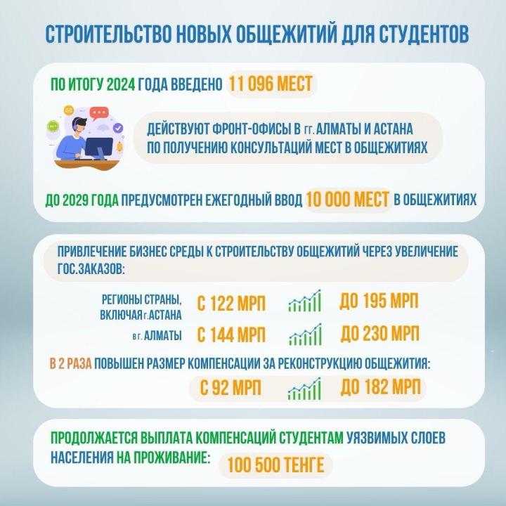 Увеличен размер государственного заказа по строительству общежитий за 2024 год в г. Алматы со 144 МРП до 230 МРП, в остальных регионах страны, включая г. Астана со 122 МРП до 195 МРП.
