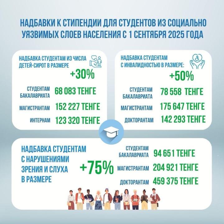 Лицам с инвалидностью или увечьями вследствие ранений, контузий, заболеваний установлены надбавка студентам бакалавриата – 78 558 тенге, магистрантам – 175 647 тенге, интернам – 142 293 тенге.