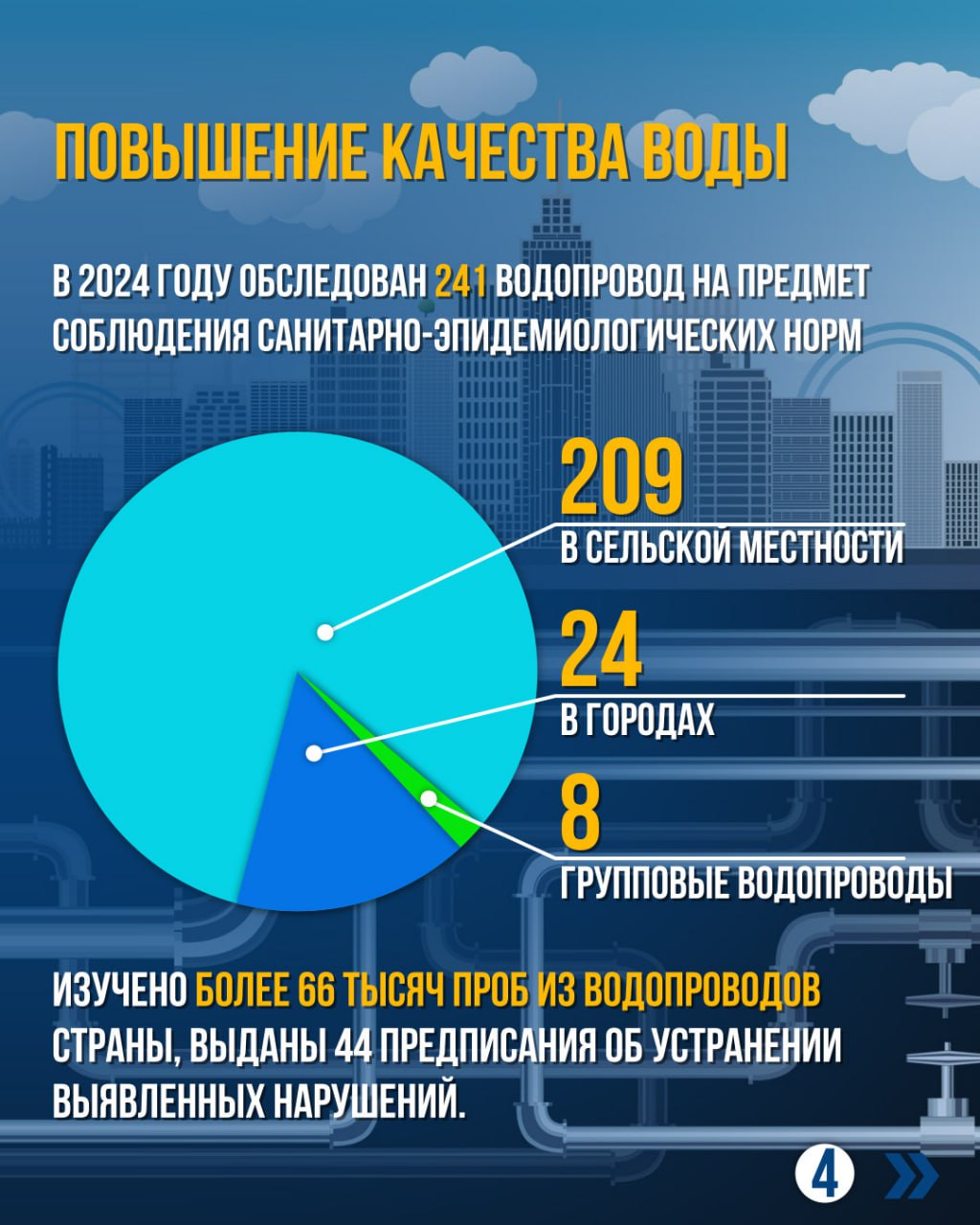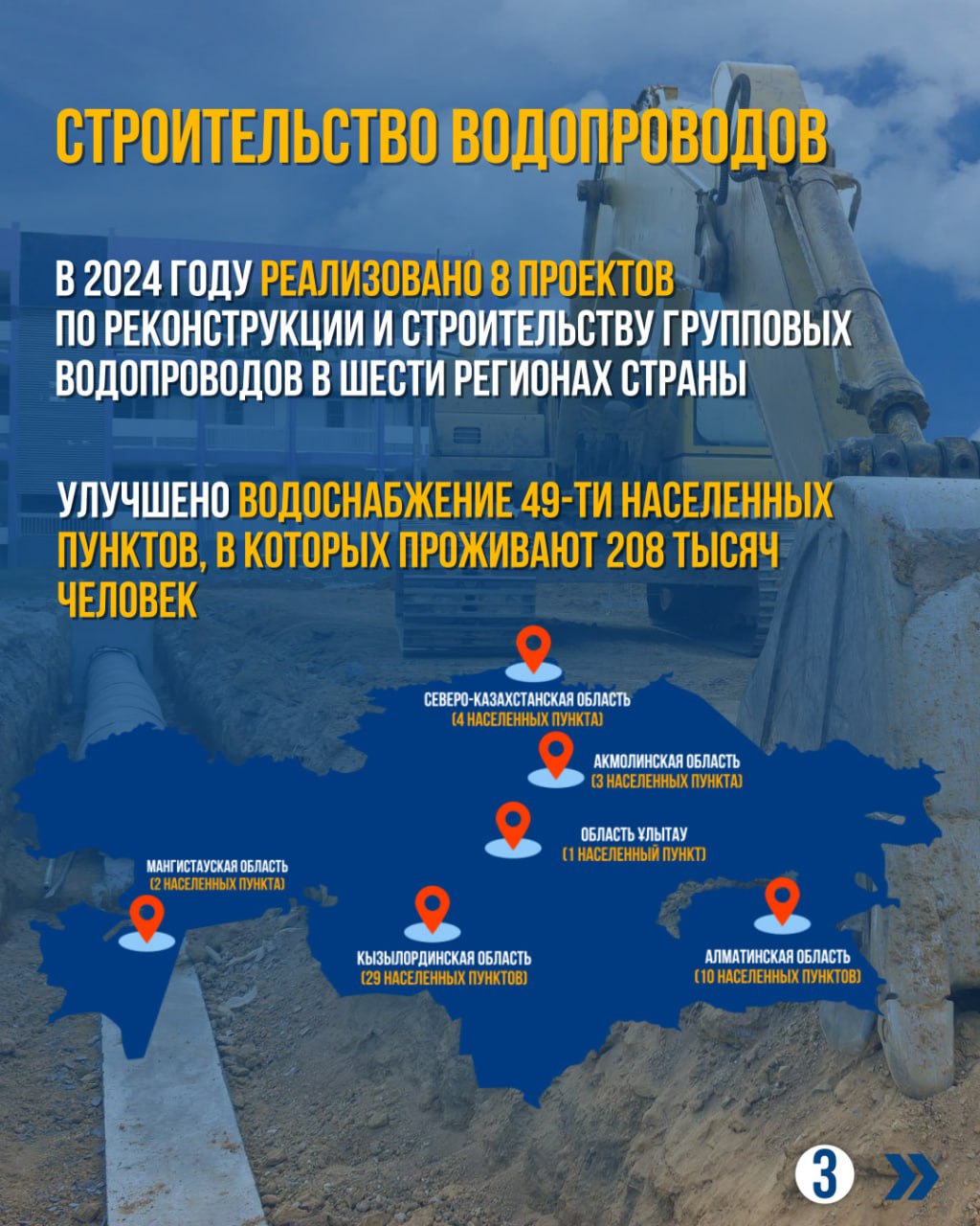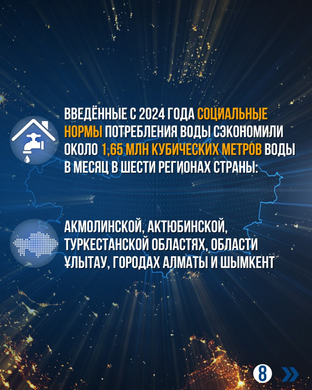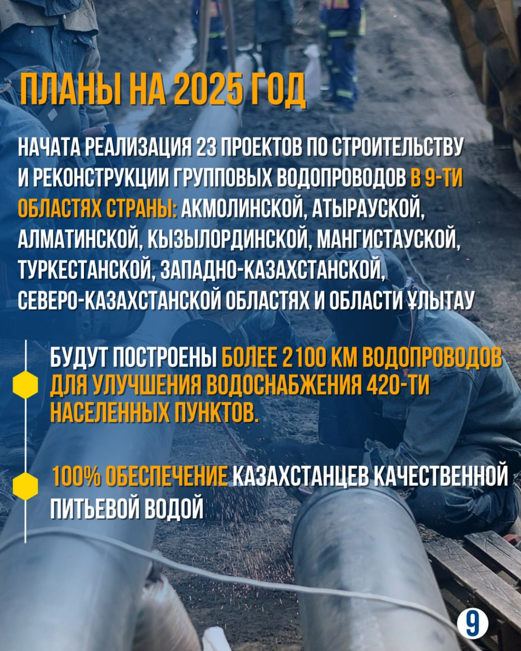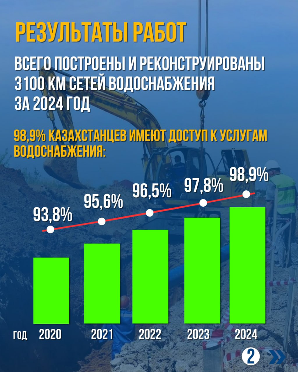 ← Предыдущая запись 2024 жылы 3100 шақырым сумен жабдықтау желісі салынып, қайта жаңартылды. Былтырғы жыл қорытындысы бойынша қазақстандықтардың 98,9%-ы сумен жабдықтау қызметтерімен қамтамасыз етілген: қала тұрғындарының 99,4%-ы және ауыл тұрғындарының 97,8%-ына сапалы ауызсу қолжетімді. →