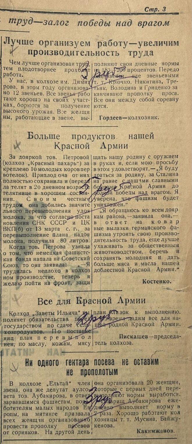 «…Нина Петрова из колхоза «Красный пахарь» и Анастасия Ухова из колхоза «Заветы Ильича» добились значительных успехов в увеличении продукции животноводства. Товарищ Петрова перевыполняла вдвое план по надою молока, а Ухова по производству мяса. Их самоотверженный труд не остался незамеченный. За повышение урожайности боролась звеньевая Башу Коснутдинова из колхоза им. Амангельды. Работницы промартели (промышленная артель) им. Островского, после ухода мужчин на фронт, успешно хорошо справлялись с тяжелой мужской работой. Товарищ Химова выполняя специальный заказ, ежедневно перевыполняла норму, работая на шерсточесальной машине, тов. Одинцова выполняла норму на 110 %….»