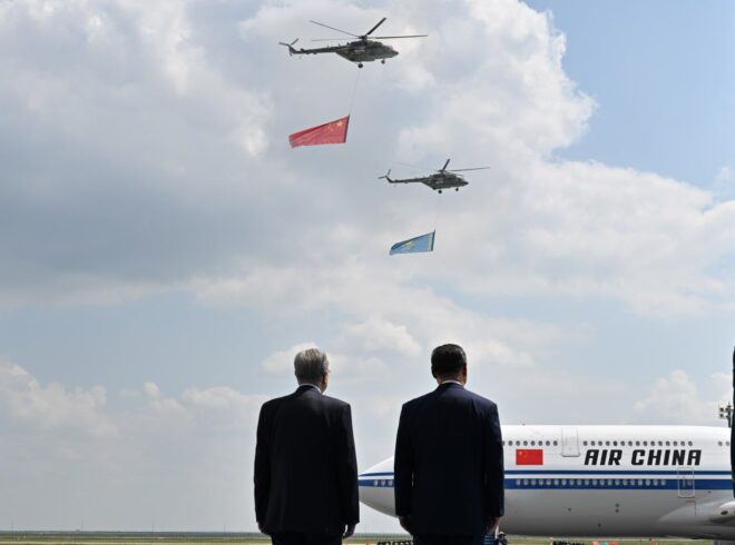 У трапа самолета была выстроена рота почетного караула. Высокого гостя приветствовали дети с флажками Казахстана и Китая.