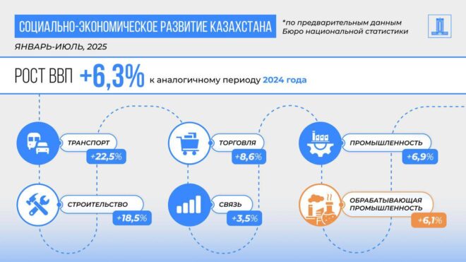По предварительным данным Бюро национальной статистики, валовой внутренний продукт (ВВП) Казахстана за январь–июль 2025 года вырос на 6,3% по сравнению с аналогичным периодом прошлого года.