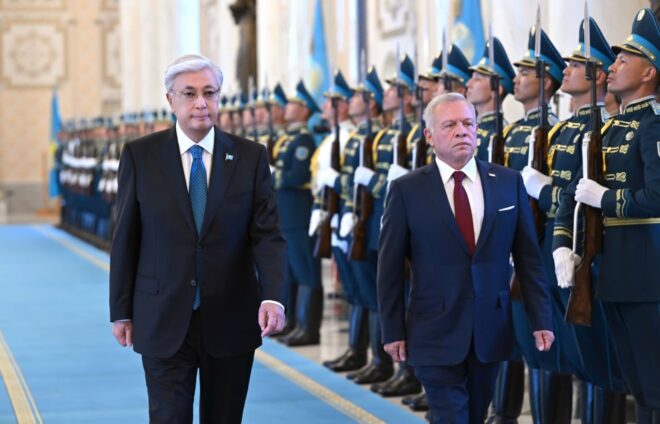 Қасым-Жомарт Тоқаев пен Король ІІ Абдалла бір-біріне делегация мүшелерін таныстырды. Содан соң Құрмет қарауылы ротасының бастығы рапорт беріп, екі елдің мемлекеттік әнұрандары орындалды.