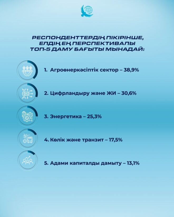 Елдің болашақ дамуы тұрғысынан респонденттер Қазақстанның аймақтық қана емес, жаһандық деңгейде де көшбасшы бола алатын бірқатар салаларын айқындады. Респонденттердің пікірінше, елдің ең перспективалы ТОП-5 даму бағыты мынадай: