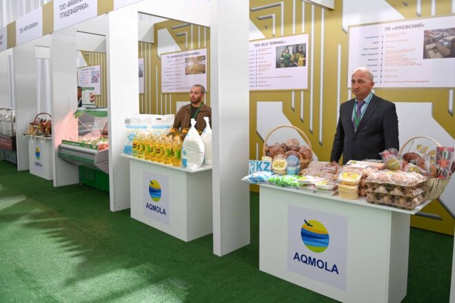 Касым-Жомарт Токаев осмотрел выставку производимой в регионе аграрной продукции, на которой были представлены полуфабрикаты, консервы, мясомолочные и хлебобулочные изделия