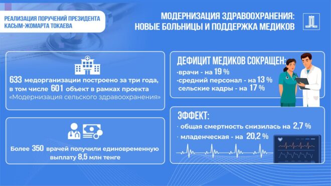 Одним из ключевых направлений является подготовка и поддержка медицинских кадров. В 2025 году медицинские вузы страны выпустили 10,5 тыс. специалистов, из которых 34% распределены в сельские медицинские организации – почти вдвое больше, чем годом ранее.