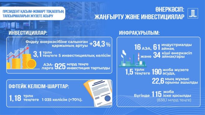 2025 жылғы қаңтар-қыркүйек аралығында өңдеуші секторда жалпы құны 3,1 трлн теңгеден астам (6,2 млрд АҚШ доллары) инвестициялар туралы 5 келісім жасалды. Ферроқорытпа өндірісі, жолаушылар вагондары, цемент сияқты және басқа да бағыттарды қамтитын тағы 4 келісім қарастырылуда.