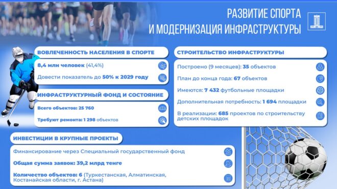 «Глава государства всегда подчеркивает важность развития спорта, который должен стать частью жизни каждого казахстанца. Во всех регионах страны ведется системная работа по развитию спортивной инфраструктуры и массового спорта.