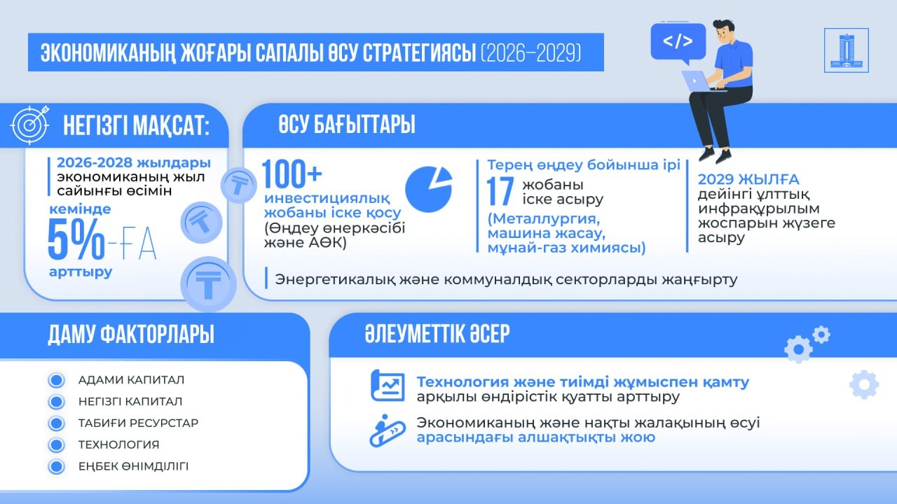 «Сапалы экономикалық өсімді қамтамасыз ету үшін шикізаттық емес секторларды дамытуға, еңбек өнімділігін арттыруға, экономиканы технологиялық жаңартуға және цифрландыруға баса назар аударылатын болады. Жыл сайын өңдеу өнеркәсібі мен АӨК-де 100-ден астам инвестициялық жобаны іске қосу жоспарлануда. Металлургия, машина жасау, мұнай-газ химиясы және АӨК-де жоғары қайта бөлудің 17 ірі жобасын жүзеге асыру жалғасуда. 2029 жылға дейін Ұлттық инфрақұрылымдық жоспарды жүзеге асыру маңызды рөл атқаратын болады. Белсенді кезеңге Энергетикалық және коммуналдық секторларды жаңғырту жөніндегі ұлттық жобаны жүзеге асыру кіреді»,